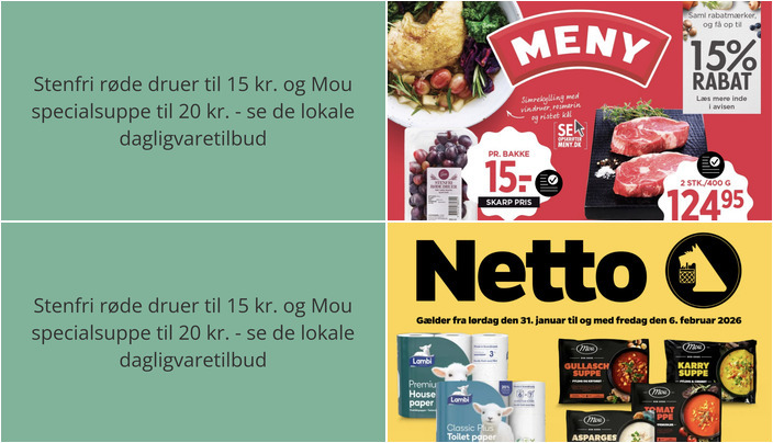 Vi har kigget på denne uges tilbudsaviser for dagligvarebutikker i Måløv og fundet nogle fantastiske tilbud. Her er et udpluk af de bedste tilbud fra Meny og Netto.
